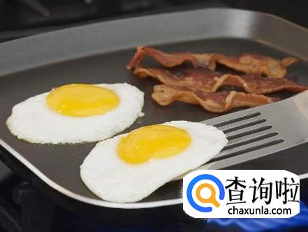锅中放入色拉油,打入鸡蛋,撒一点盐,把鸡蛋煎熟,同时把培根煎一煎。