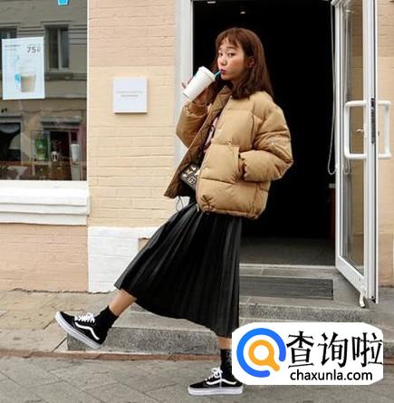 冬天长裙搭配短款羽绒服。短款的羽绒服特别保暖,短款羽绒服搭配冬天长裙有一种很活泼的感觉。