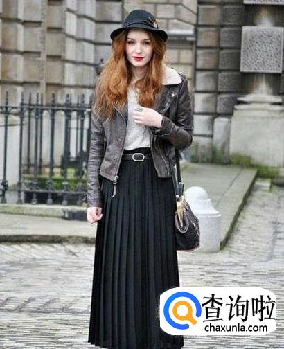 冬天长裙搭配皮衣外套。皮衣外套有一种潇洒随性的街头风,配上冬天长裙有一种潇洒利落的感觉。