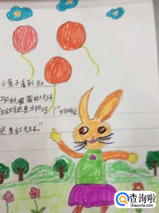小兔子抬起头,看见天上飘着红红的、圆圆的气球问妈妈:“妈妈,这是太阳吗?”妈妈说:“不,这是红气球·······”