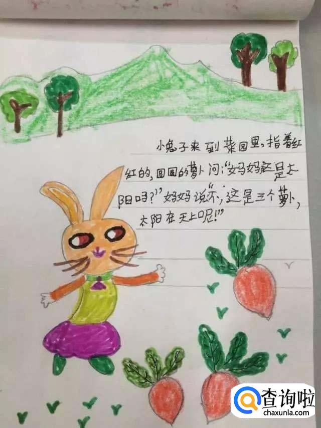 小兔子来到菜园里,指着红红的圆圆的萝卜问:“妈妈这是太阳吗?”妈妈说:“不,这是三个萝卜,太阳在填上呢!”