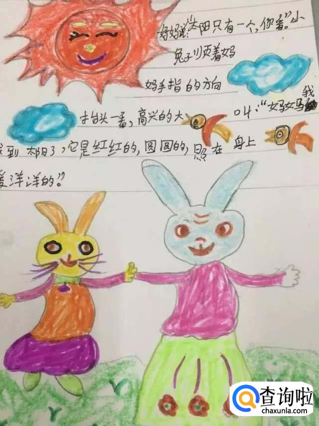妈妈说:“瞧,太阳只有一个!”小兔子顺着妈妈手指的方向,抬起头,大声叫:“妈妈,我找到了,太阳红红的,圆圆的、亮亮的,照在身上暖洋洋的。