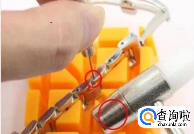 然后我们可以先试一下自己的表,看一下自己的表带长了多少,自己心里有个数,然后通过表带上面的箭头找到表带链接轴的方向。