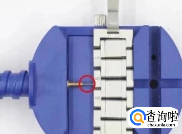 然后把自己的表带固定到工具盘上面,然后用工具上的针对准表带上面的针孔,然后把固定表带的针孔顶出来,然后去除多余的表带。
