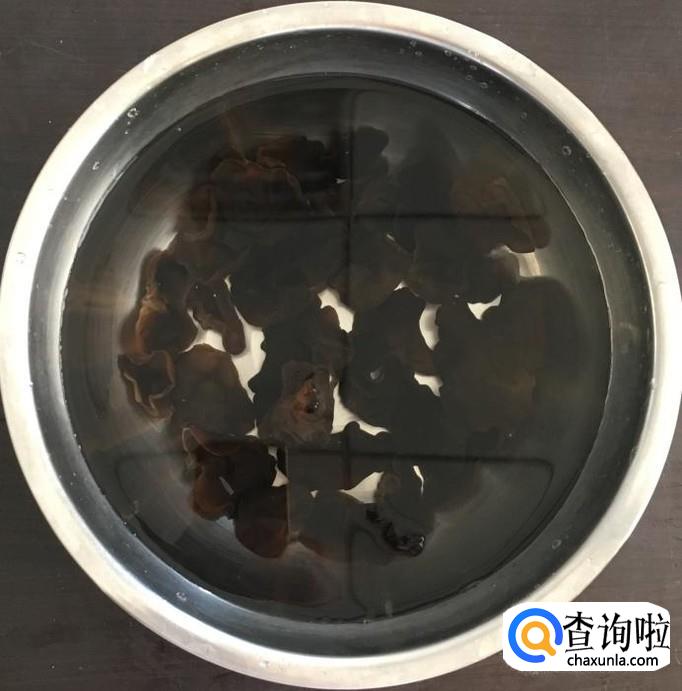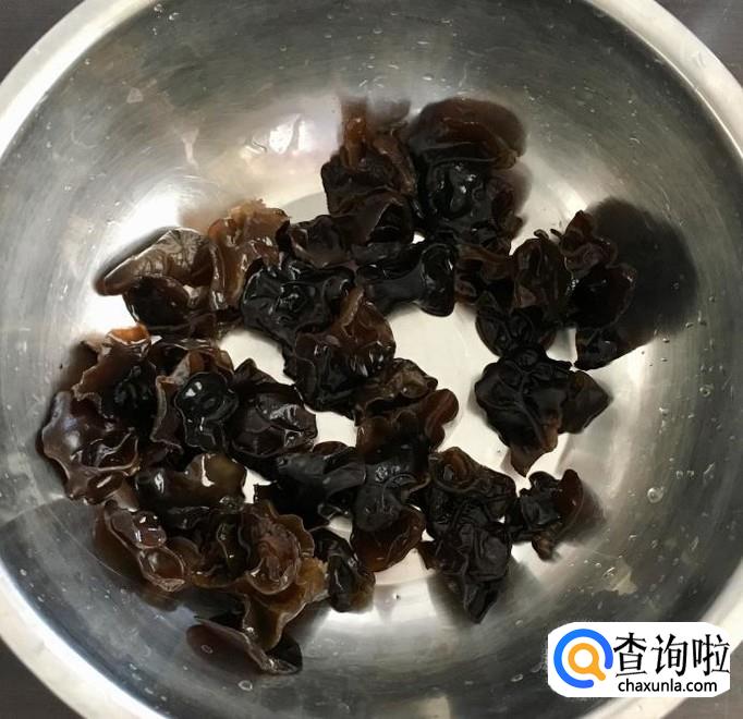 木耳泡发3至5个小时择洗干净根部的杂质,把大一点的水发木耳撕成小块