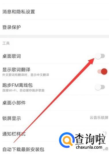 在设置页面,向下滑动即可找到桌面歌词,将图示位置的开关打开即可,如图所示。