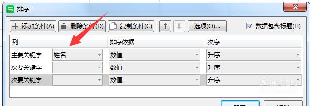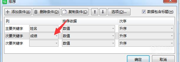 在弹出的对话框中,首先选以成绩为主要关键词,升序;其次选择名字作为次要关键词,升序,编辑完成后点击确定,可以看到表格排序结果;