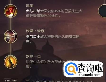 剩下的选择凯旋欢欢还有致命一击,增加自己的输出能力以及生存能力,一般如果一场团战只要敌方死了,那么你的凯旋就有用。