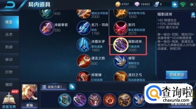 第二件装备,我们可以出暗影战斧,这个装备的性能是比较多的,这也是为什么我们要在第二件装备就出它,有500的血量增加,其次还能缩短技能的冷却时间,这对于前期的狂铁来说是非常实用的。