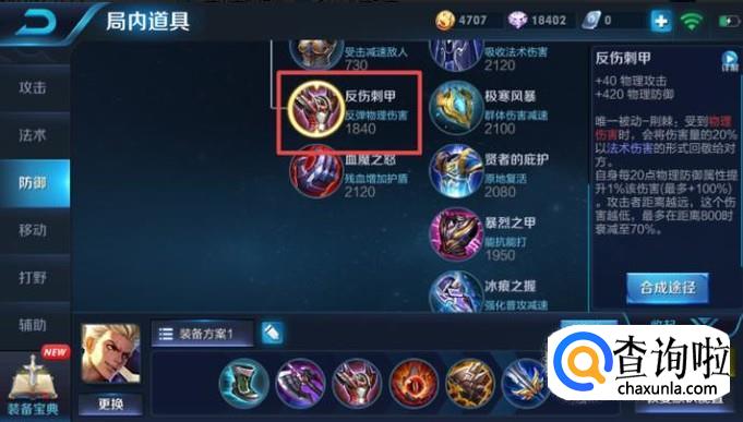 之后我们应该出反身刺甲,这个装备其实出的不是为了被动技能,而是为了420物理防御,此时对方的射手攻击力已经很高了,我们需要防止被对方直接平A掉,所以,我们需要出一个增加高额防御力的装备。