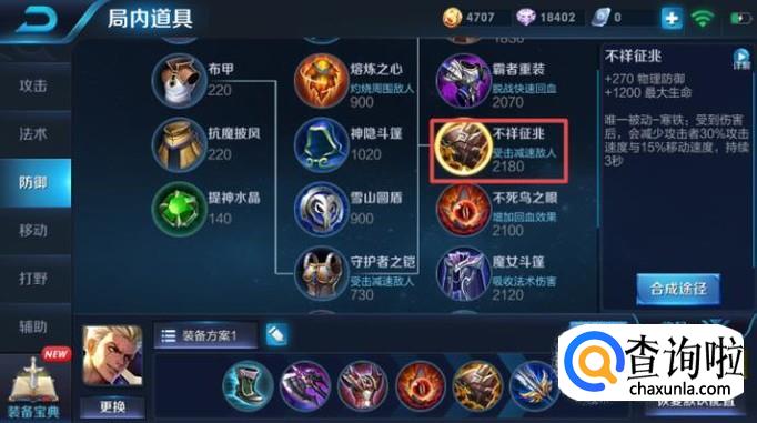 然后我们该出不祥征兆,这个装备增加1200血量,其次还能增加270物理防御,出了这个装备之后,我们就不需要害怕对方的射手了,可以直接上去强杀对方了。