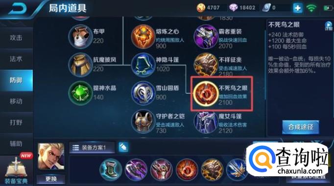 之后我们该出不死鸟之眼,这个装备1200血量,还有240的法术防御,这个就是我们出它的原因所在了,此时我们在上路其实已经不需要太担心了,我们可以适当的去中路抓对方的法师,这个装备主要就是增加我们的血量和法术防御。