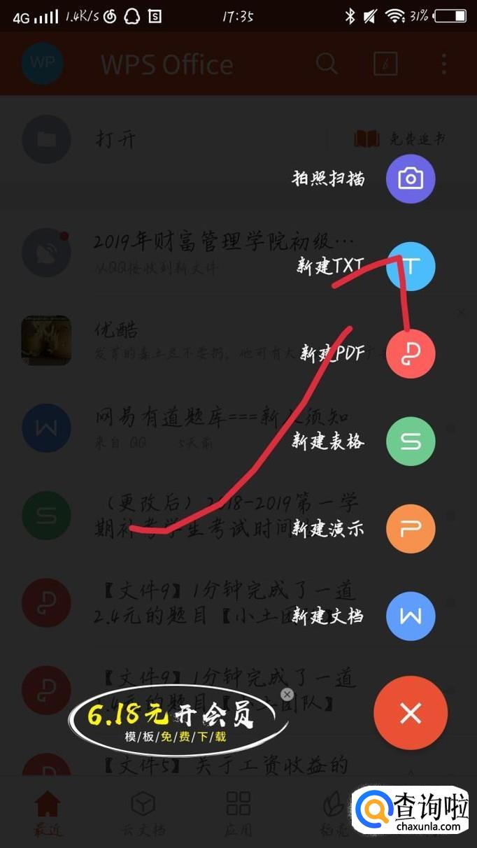 点击右下角的“+”选项,如图1箭头所示。会出现一个新的界面,点击“新建txt”选项,如图2箭头所示。