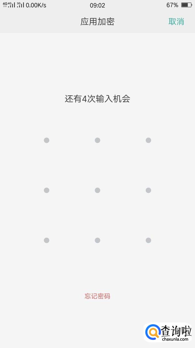 点击了“权限隐私”之后,我们可以看到第一个选项就是“应用加密”,点击进入,需要输入应用加密的密码,我们输入的密码肯定是错误的,输入错误一次之后,点击下方红色的“忘记密码”。