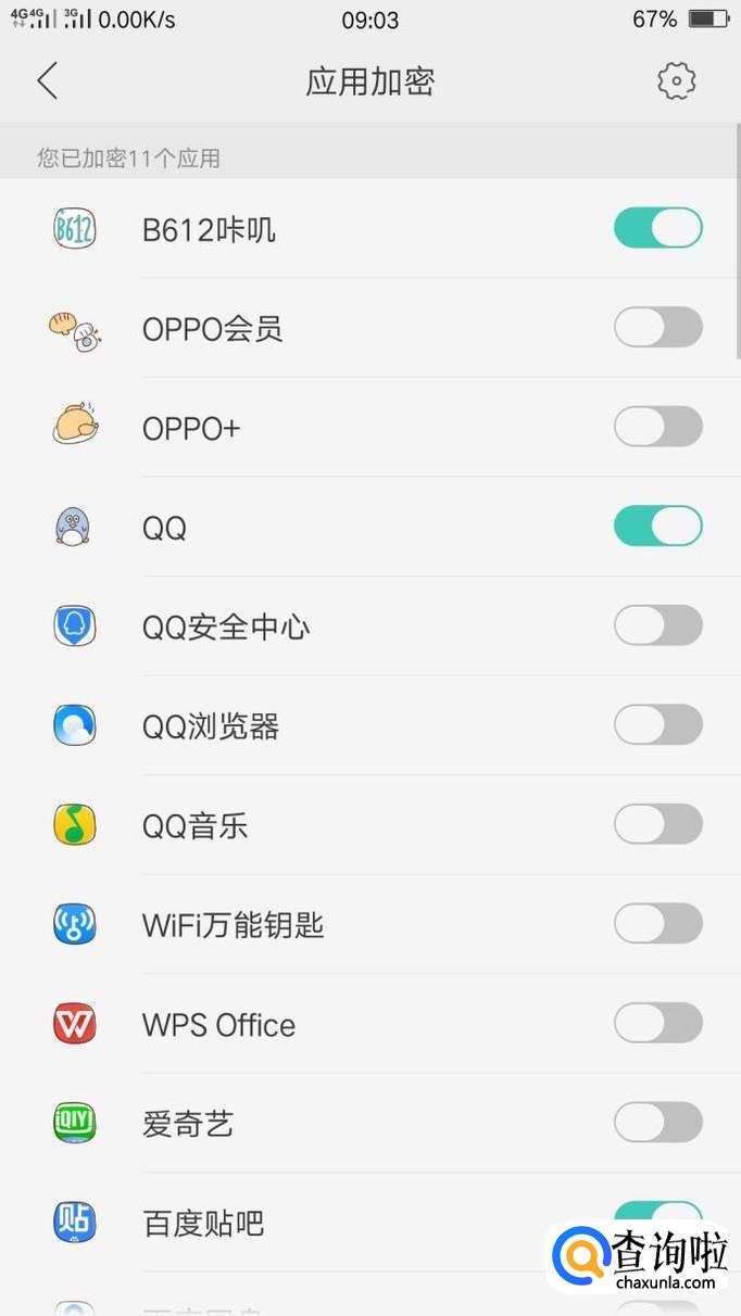 成功更改密码之后,点击下图一右上角的设置按钮,进入加密设置界面,我们可以将指纹设置为开启加密应用另一个方法,这样就不用担心忘记加密的密码了!