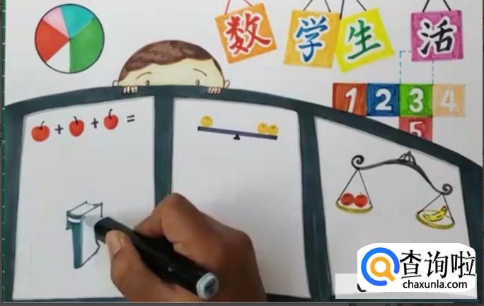 在数学生活中我们会学到什么呢?当然是算术题,还有秤砣,还有哪边比哪边大的这种比大小了,所以呢,我们就在这三个框架内画上三个不同的图案吧。