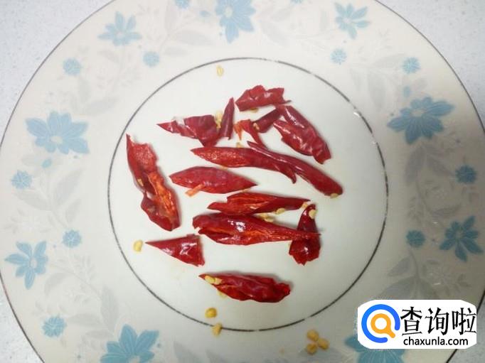 红干椒用水清洗干净,控干水分,斜刀切成段。切好葱,姜,蒜,备用。