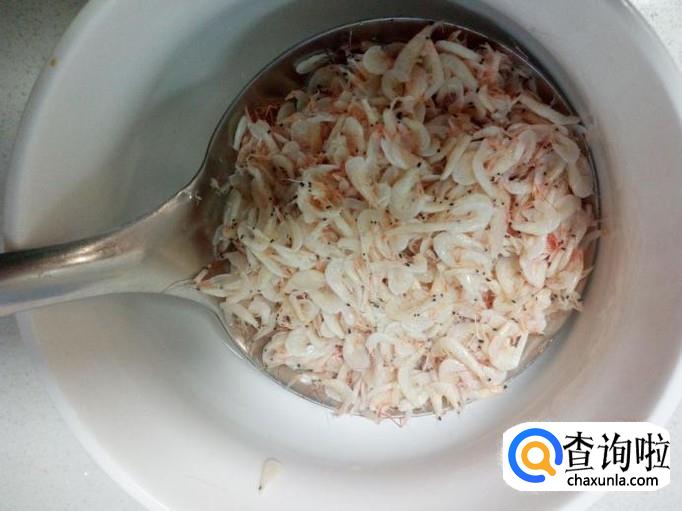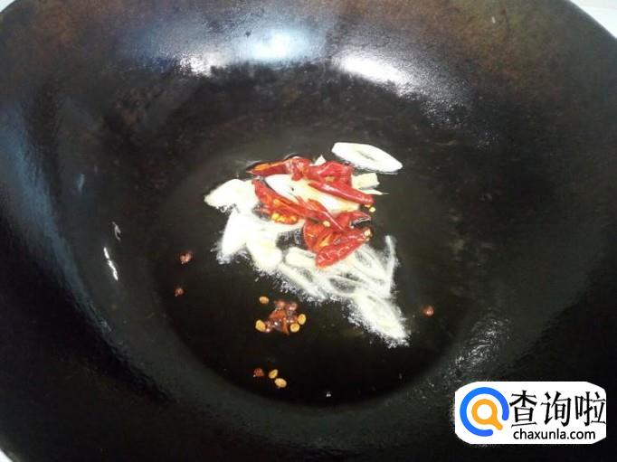 锅里放入油加热,油热后放入花椒,红干椒,葱,姜,蒜,爆锅。放入虾皮小火翻炒,炒出香味。
