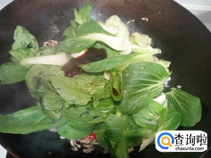 放入油菜转大火快速翻炒,放入一匙儿蚝油,料酒,少许盐(不是脱水的虾皮,慎重放盐)。