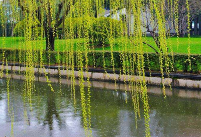 宋 志南的《绝句》“古木阴中系短篷,杖藜扶我过桥东。沾衣欲湿杏花雨,吹面不寒杨柳风。”整个画面色彩缤纷,充满着蓬勃生气。,表达了诗人对春雨的喜爱。