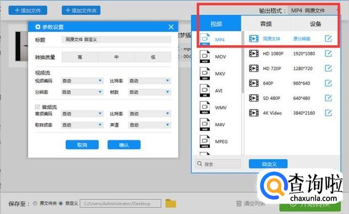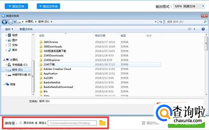 打开后,点击下方的保存地址中的自定义按键,然后再点击文件夹图标,将输出视频MP4文件的保存地址设置为桌面即可,