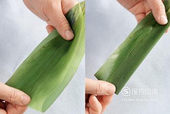 将大片的粽叶拿在手里,对折,双层的下边向上折,如图所示,然后用手压实就可以了。