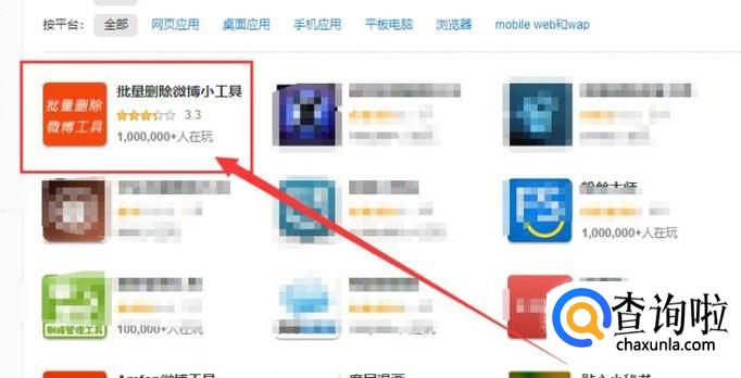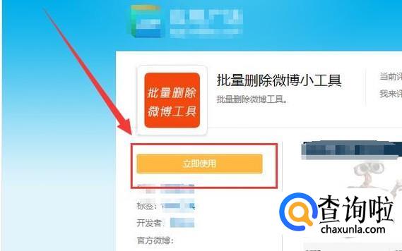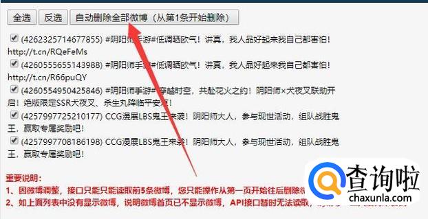 授权成功之后,进入到小工具页面,选择图示位置按键,即可批量删除新浪微博,如图所示。