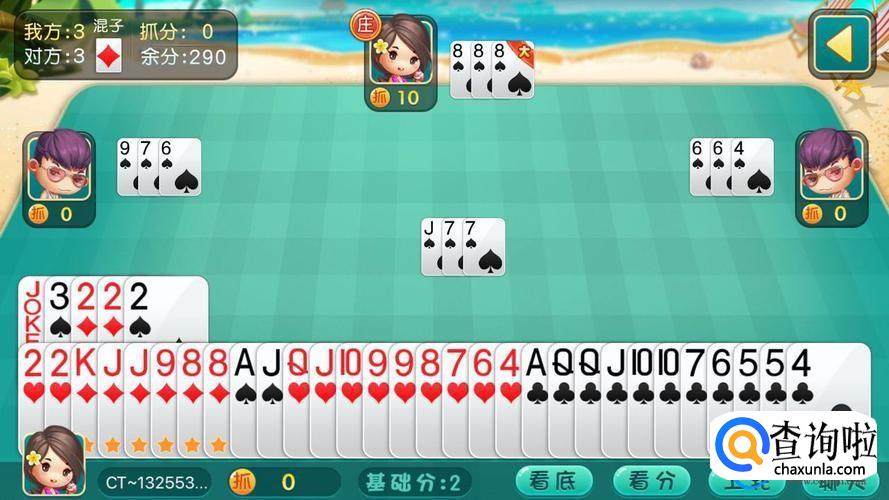 2.每一名玩家首先需要亮一张牌,最大的牌是大王,亮出大王的玩家直接作为庄家,除了大小王牌以外,其他的花色可以主画色为主,首先所有的玩家从底牌中随便翻一张牌,牌面最大的玩家作为庄家,两个玩家的牌相同,系统会自动选择其中一名玩家作为庄家。