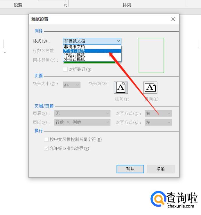 在弹出的隐藏列表中选择【方格式稿纸】: