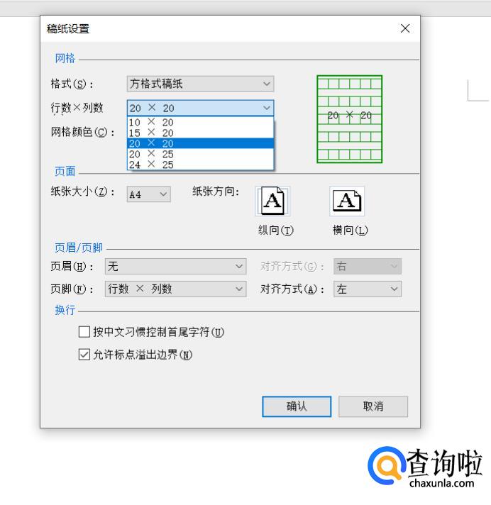 在【行数*行数】一栏默认的是20*20的页面格式,也就是一行20个方格一共20行,这里点击后还可以选择其它格式: