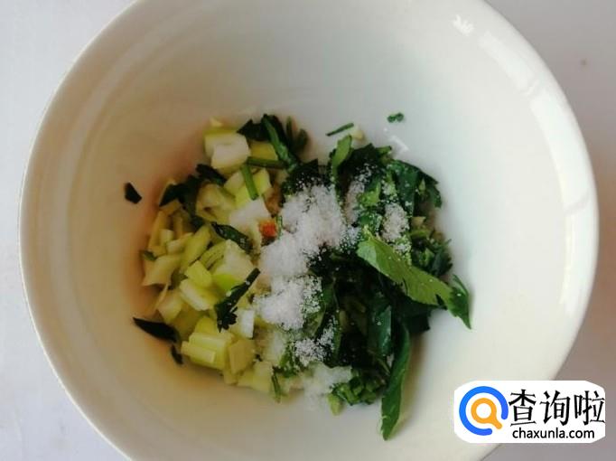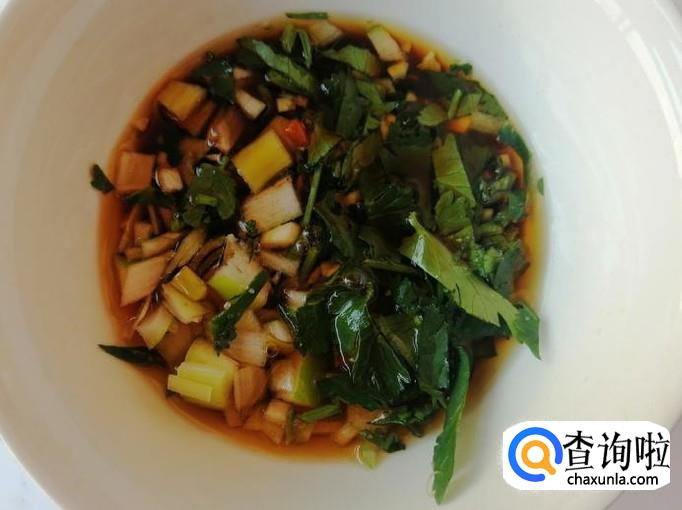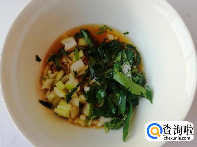 把准备好的蒜末、香菜末、葱末放入碗中,加入食盐、香醋、生抽、香油用勺子搅拌均匀备用。