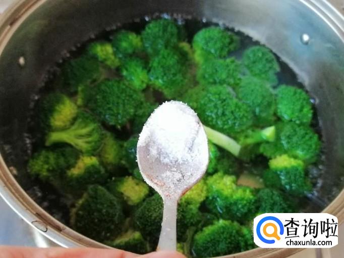 煮锅烧水,水开后放入洗好的西兰花,加入适量食盐,烫出来的西兰花不变色,会显得更翠绿,焯水两分钟就可以。