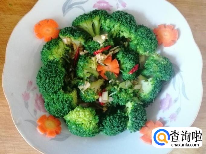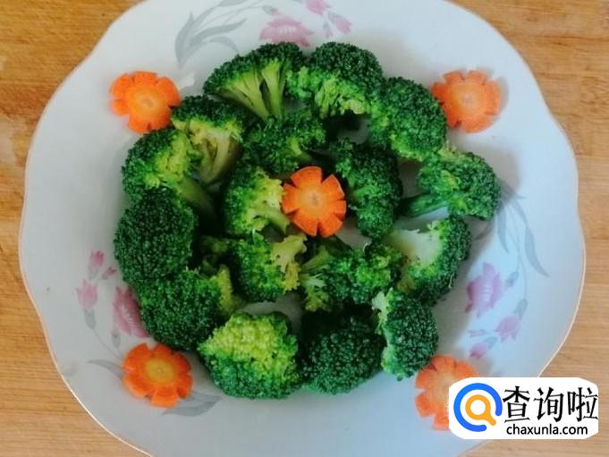 把焯过水的西兰花摆入盘中,加入切好的胡萝卜花,胡萝卜放少许就可以,因为生吃胡萝卜不容易消化,在这里启点缀作用。