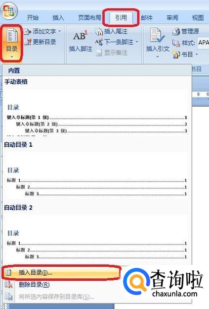 首先,我们先插入目录。打开一篇Word文档,点击标题栏“引用”,在工具栏选择“目录”,在下拉菜单中点击“插入目录”。