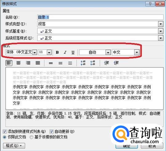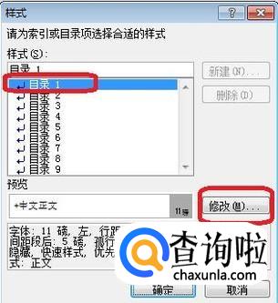 弹出“修改样式”选项框,在其中就可以对该级目录的文本格式进行修改了,要修改各级目录的文本格式,只要选中之后,重复步骤3和4就可以了。