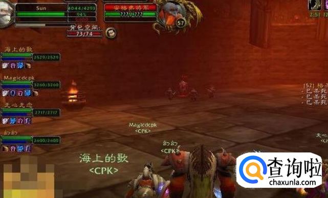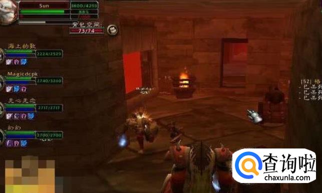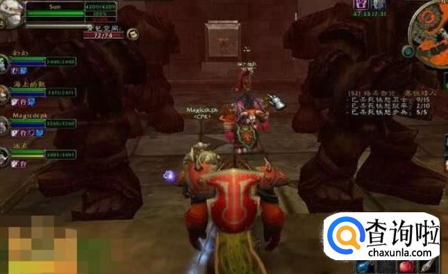 搞定这个房间,对面的房间就是傀儡统率和2个石头傀儡。此处难度非常之大,BOSS本身是个萨满会闪电链,两个小的傀儡攻击也很高,治疗者一定要十分注意战士的血。不能低于2400。否则可能出现瞬间掉光血的情况。干掉后就要面对深渊里最变态的3火焰元素阵了。