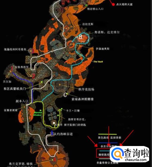 黑铁的遗产:此任务为黑暗深渊必作任务,可以得到开启深渊内部的门的钥匙。接任务必须在死亡状态下在地图的A点接任务,然后去杀掉弗诺斯。达克维尔并拿回战锤铁胆,到C点的索瑞森神殿雕像前完成任务,得到暗炉钥匙。