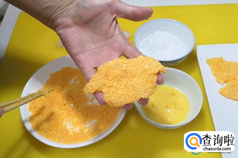 此时再将其放入鸡蛋液中,裹上一层鸡蛋液,最后再裹上面包糠。通常这样的顺序可以有效的避免鸡胸肉表面太多的水分,如果直接将其先粘鸡蛋液,可能会导致后续的面包糠是特别难以粘上的。