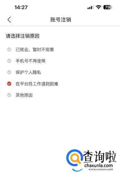 进入账号注销的页面【选定注销的原因】后点击【下一步】选项;