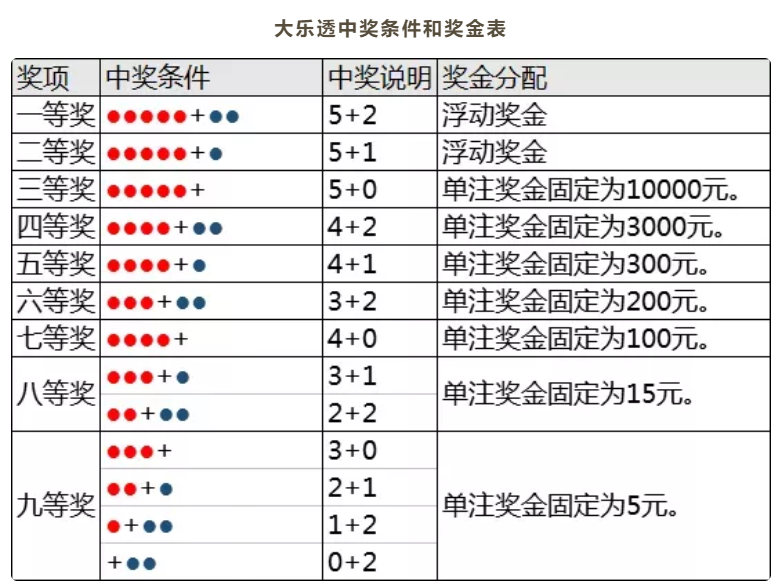 大乐透自2019年第19019期(2月20日开奖)实施新的开奖规则,13个中奖条件不变,6个奖级增至9个奖级。一等奖:5+2,最高奖金1000万元,追加最高奖金800万元(80%);二等奖:5+1,最高奖金500万元,追加最高奖金400万元(80%);三等奖:5+0,奖金10000元;四等奖:4+2,奖金3000元;五等奖:4+1,奖金300元;六等奖:3+2,奖金200元;七等奖,4+0,奖金100元;八等奖:3+1,2+2,奖金15元;九等奖,3+0,2+1,1+2,0+2,奖金5元。具体如下图。