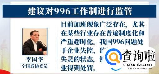 近日在政协会议上有部分政协委员针对我国996工作制度的一些问题提出了呼吁监管加班文化的建议,认为长期以往的这种工作制度会引起企业失控,公会失灵还有监管失序的状态,对于社会的影响比较重大,这个建议主要还是为了防止企业让员工超时加班。
