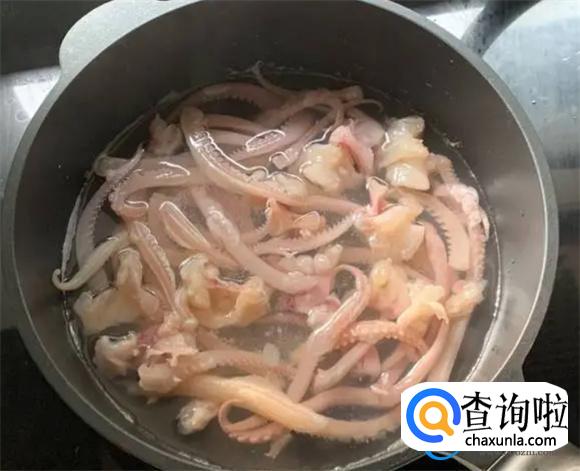 首先将事先准备好的鱿鱼,处理干净之后,根据自己平时的饮食习惯开始切。由于有些人会尝试将鱿鱼划割成片花、将切好的鱿鱼需要放入滚烫的水里面焯水,一般焯水10秒需要将鱿鱼捞出。