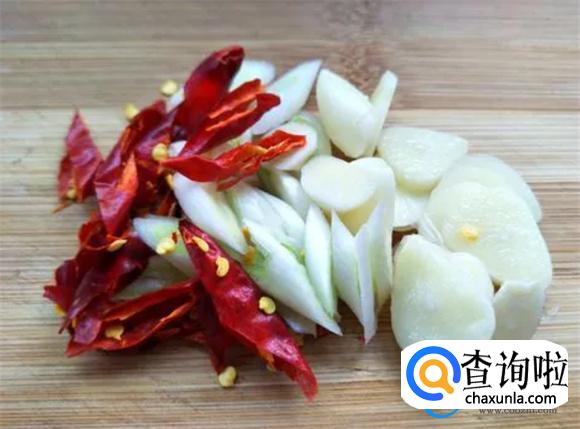由于捞出之后将其放到一边备用,这时候开始处理老姜片、大蒜头、辣椒片等等。