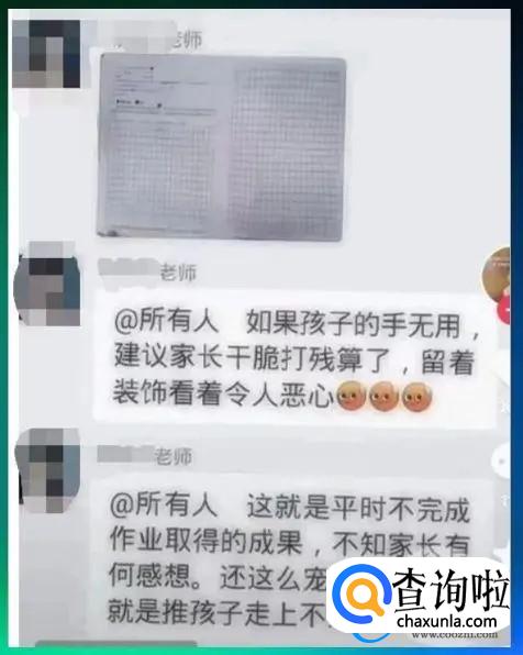近日在网络上广传了一个微信截图,截图中是一名小学五年级的老师在家长群建议家长“打残孩子,手留着令人恶心”的不文明言论,截图发出之后受到了广泛关注。最新消息,目前这次事件教育局已经介入调查,也有记者试图联系涉事小学,但都没有接到任何回应。即便老师表示孩子没有按时完成作业,留着手有什么用,这名老师的诸如此类的话令人愤怒。