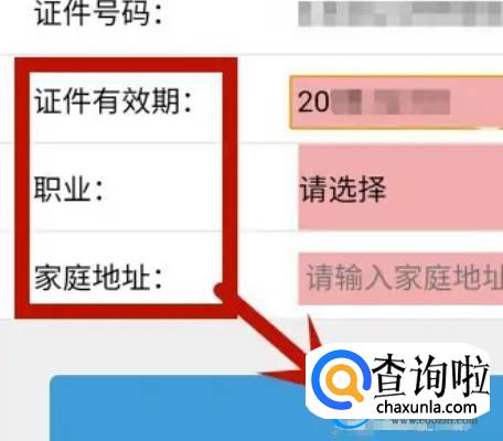 完善信息并提交进入银行预留信息补录页面,输入证件有效期,职业,家庭地址,点击提交。