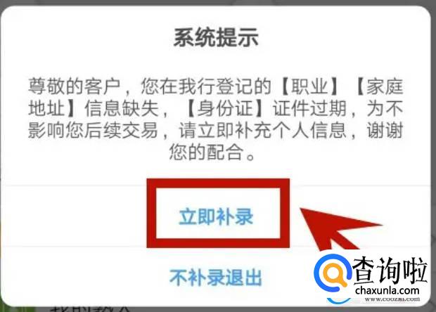 选择立即补录页面弹出系统提示,点击立即补录。