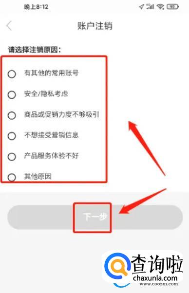 进入账户注销,选择注销原因,点击【下一步】。