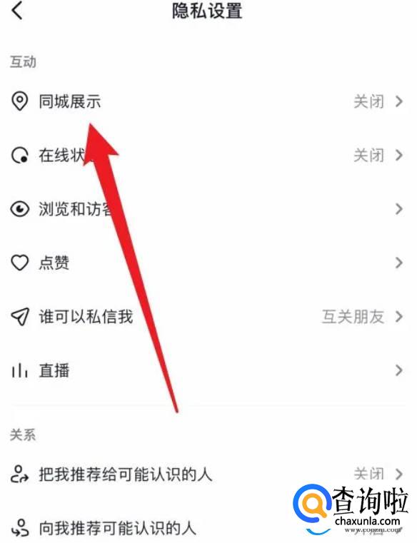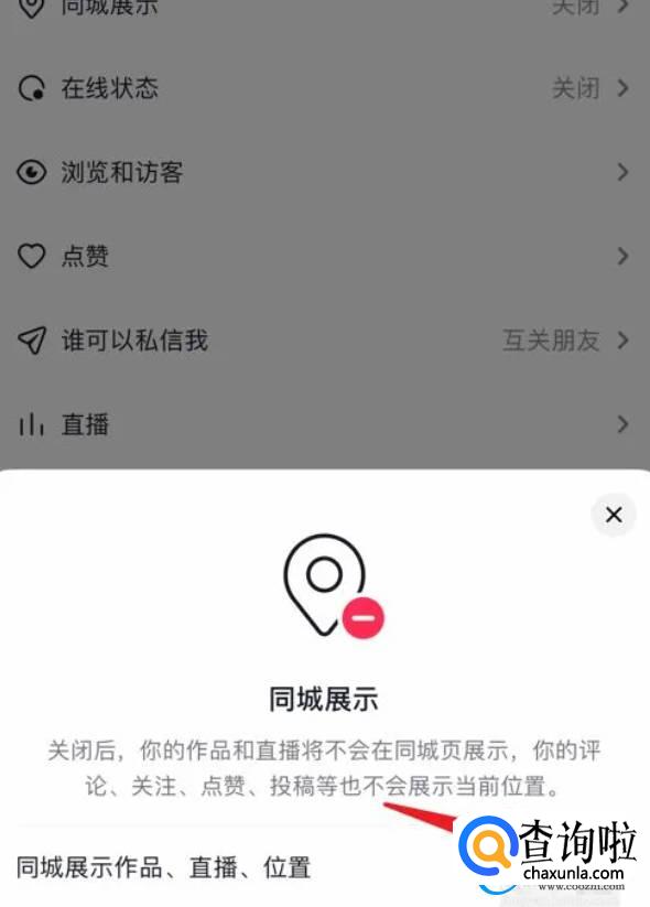 点击关闭“同城展示”设置,即可关闭抖音闲爬择ip地址的显示。