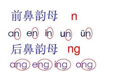 普通话中有前鼻韵母和后鼻韵母之分,以-n为韵尾组成的韵母就叫前鼻韵母,以-ng为韵尾组成的韵母叫后鼻韵母。