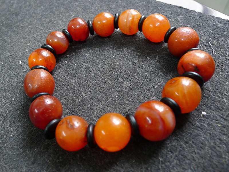 玛瑙也作码瑙、马瑙、马脑等,是玉髓类矿物的一种,经常是混有蛋白石和隐晶质石英的纹带状块体,硬度6.5-7度,比重2.65,色彩相当有层次。有半透明或不透明的。原形态三方晶系。常呈致密块状而形成各种构造,如乳房状、葡萄状、结核状等,常见的为同心圆构造。具有不同颜色构成的玉髓,通常有,绿、红、黄、褐,白等多种颜色。按图案和杂质可分为缟玛瑙、缠丝玛瑙、苔玛瑙、城堡玛瑙等。常用作玩物、观赏物、饰物或玩赏物。古代陪葬物中常可见到成串的玛瑙球。